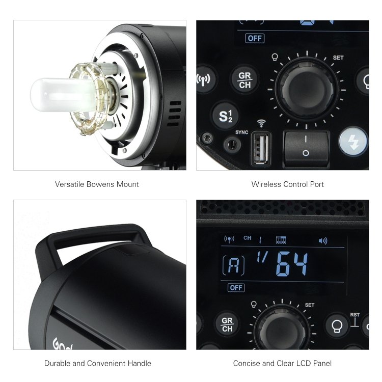 4. 600+/-200K accurate color temperature and stable output. 16 flash groups (0~9, A~F) and 32 channels (1~32) can be set, and there are 3 modeling light modes (OFF, PROP, percentage).