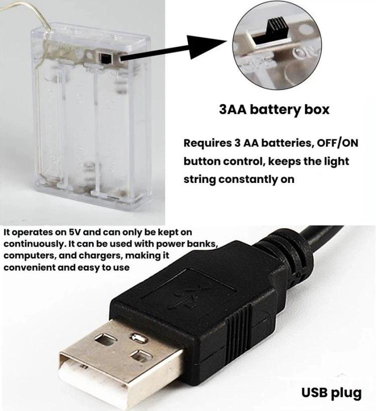 – Battery box: need to install 3 AA batteries (not included), the light string stays on