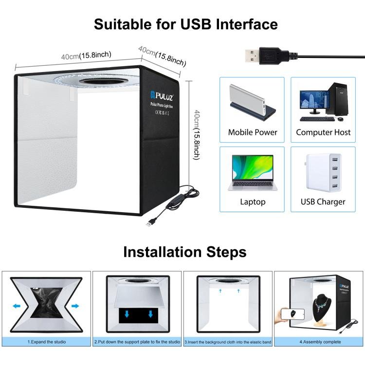 Be the first to review “PULUZ 40cm Folding Portable Ring Light USB Photo Lighting Studio Shooting Tent Box with 6 x Dual-side Color Backdrops, Size: 40cm x 40cm x 40cm, 40cm”