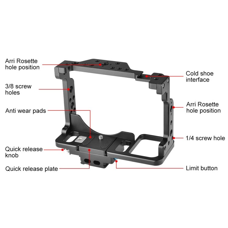 3. Expansion: This cage comes with multiple mounting points, such as 1/4 inch & 3/8 inch threaded holes, cold shoe and 3/8 inch locating holes, allow you to attach more accessories. With a built-in Arca quick release system, the cage allows the fast switch between tripod shooting, handheld shooting, and gimbal shooting.